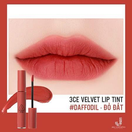 đỏ đất là sự kết hợp hài hòa giữa 2 màu son đỏ và đất. Thỏi son kem lì 3CE Velvet Lip Tint màu Daffodil giúp bạn gái trông thật dịu dàng nữ tính hơn hẳn